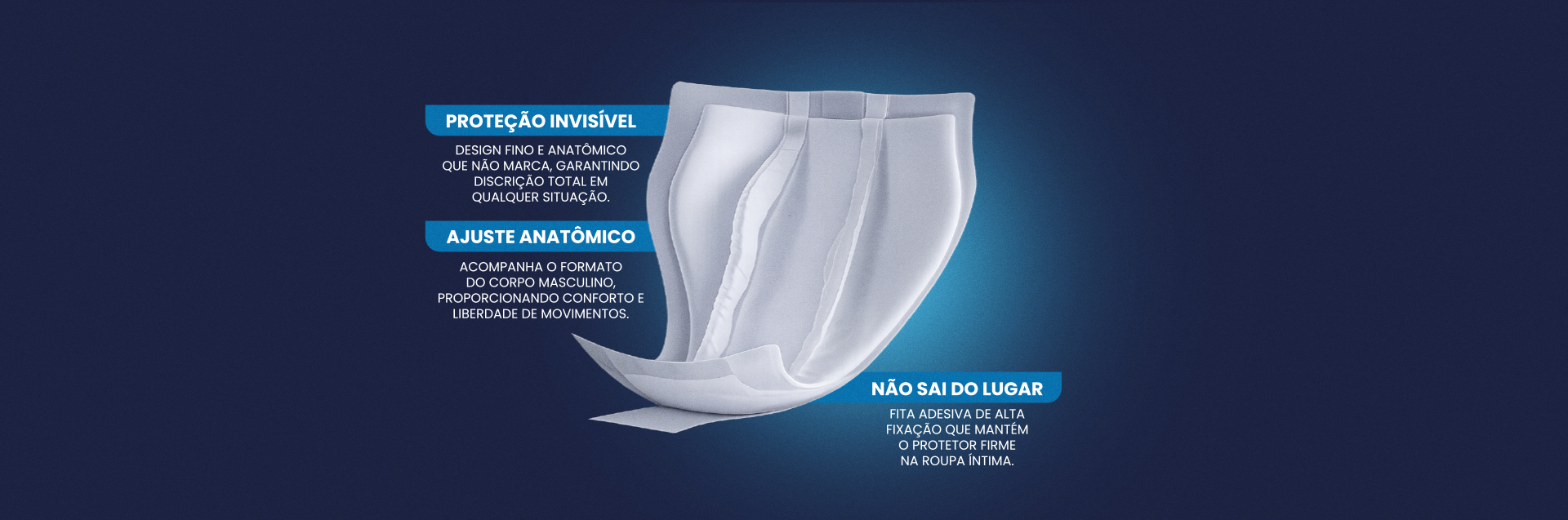 Tecnologia de alta performance aplicada a uma estrutura inteligente, com barreiras e canais desenvolvidos especialmente para a anatomia masculina. Um produto pensado para entregar proteção leve com máxima segurança e total discrição, proporcionando conforto e confiança em todos os momentos do dia.